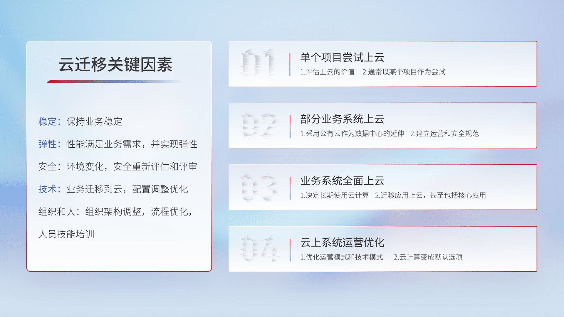 结合实际业务,,,从规划设计、、、云平台选型、、云原生改造、、、、数据迁移、、、集成交付,,迁移全过程为客户识别最佳上云路径,,,,做好风险识别管理,,设计网络架构、、、、身份权限、、、、安全审计合规、、、、操作审计、、日志审计、、监控告警策略、、、多站点容灾设计等,,,,对云上基础设施进行整体规划,,,,提升IT治理水平,,,以满足弹性、、高可用、、高性能的需求。。。。
