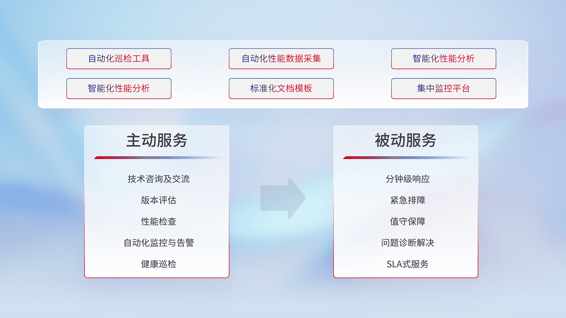 智能化工具和标准化文档,,,保障服务质量,,,,提供主动服务(包含技术咨询、、版本评估、、性能检查、、、自动化监控与告警、、、健康巡检)和被动服务包含(分钟级响应、、、紧急排障、、、值守保障、、、问题诊断解决、、、SLA服务)。。。